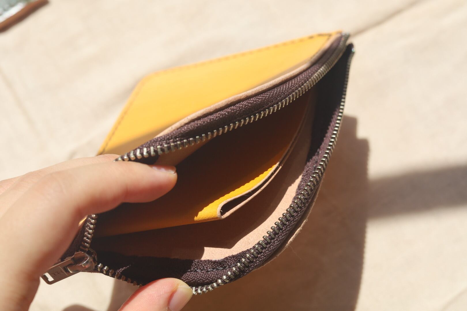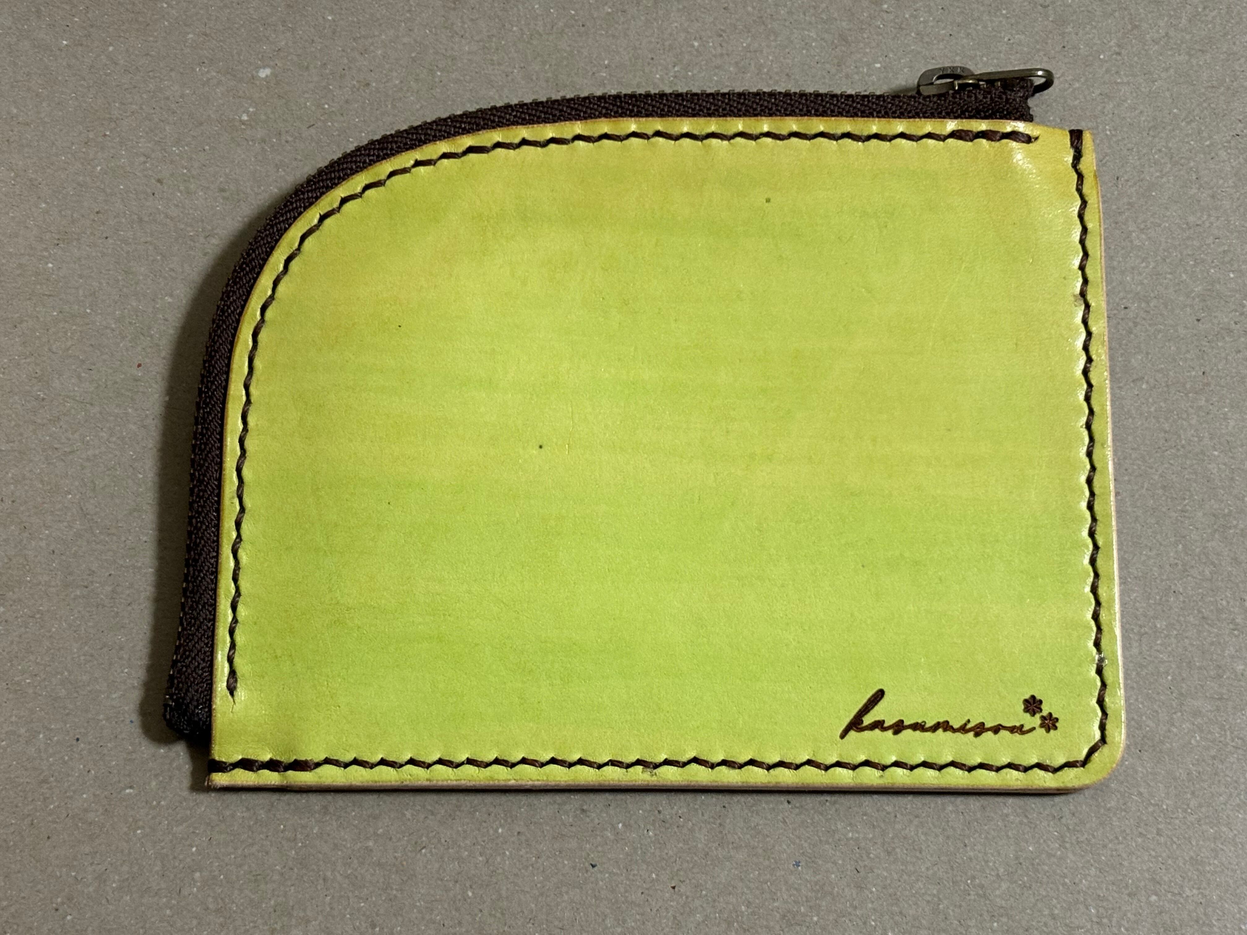 ヌメ革を使用しており、手縫い・手染めしています。